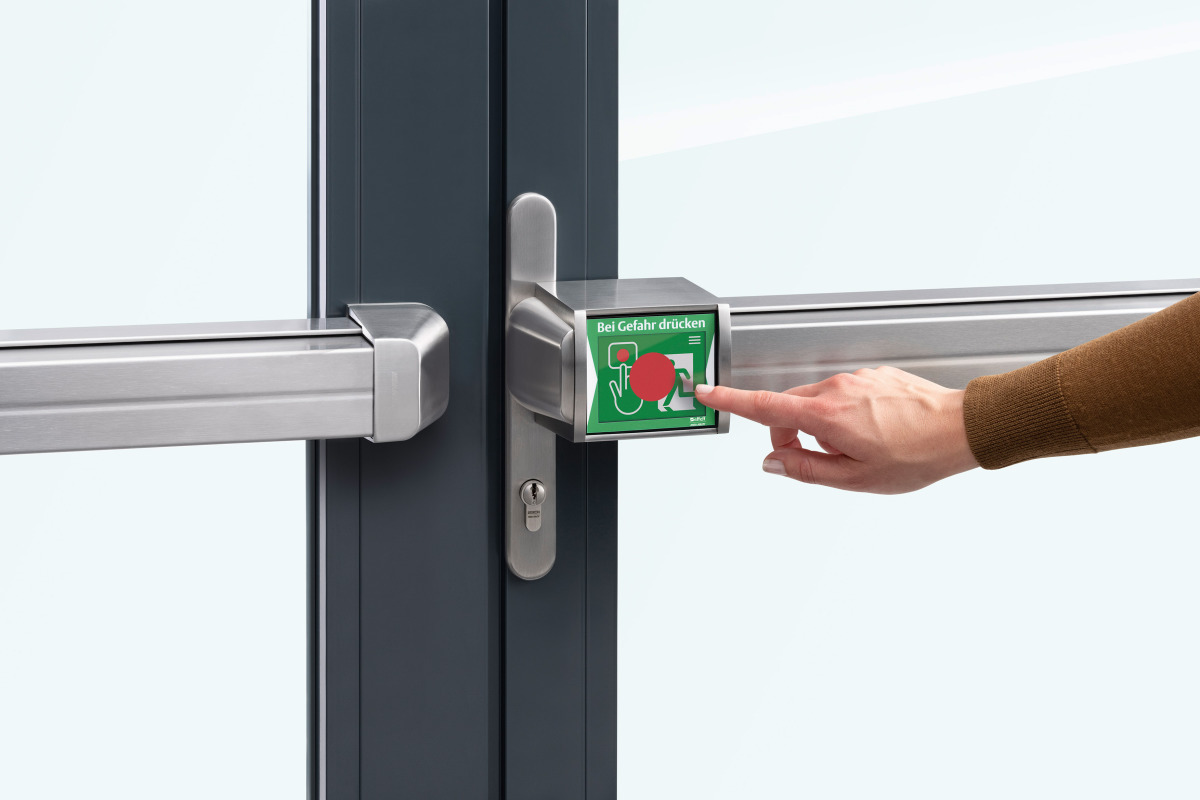 Die „ePED“ Panik-Druckstange mit integriertem Display-Terminal von Assa Abloy vereint in einem Element Panikstange und Fluchttürsteuerterminal. Somit ist kein separates Bauteil an der Wand notwendig. Sie kommt ohne großen Verdrahtungsaufwand aus und kann komplett funktionsfähig vom Türenbauer geliefert und aufgebaut werden.
