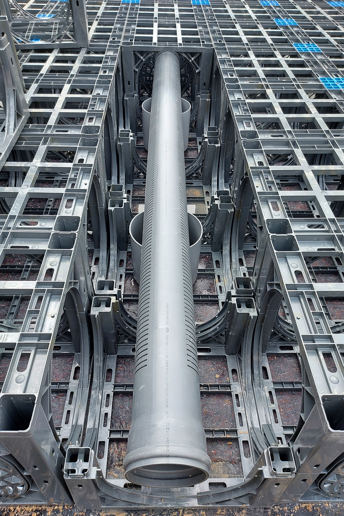 Der Retentionsraum besteht aus insgesamt 648 Elementen des D-Raintank 3000-Systems der Funke Kunststoffe GmbH, die fachgerecht eingebaut und mit einer Kunststoffdichtungsbahn (KDB) aus PE-HD...